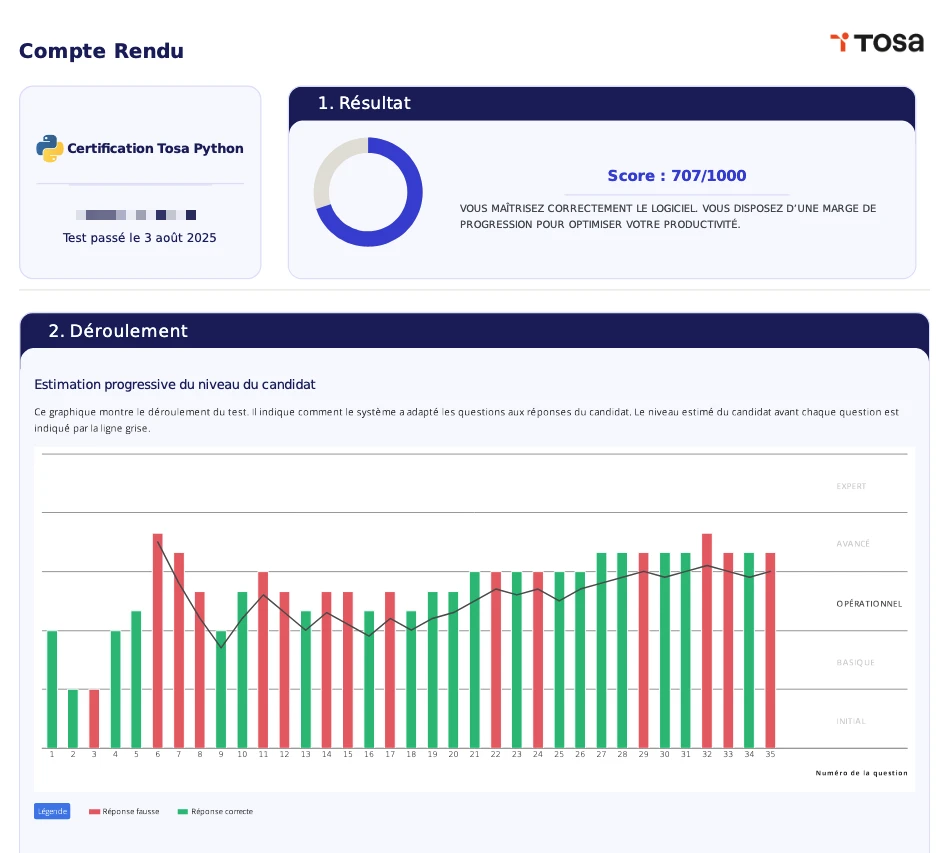 Chez Docstring, nous avons décidé de proposer la certification TOSA car elle couvre un spectre très large de compétences nécessaires en Python.