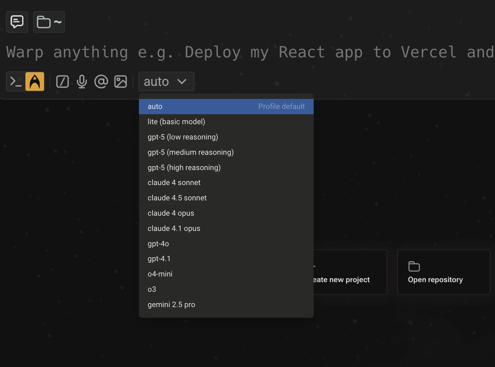 Comme je l'expliquais précédemment, Warp, en plus d'être un "terminal IA", peut être utilisé comme agent. Vous pouvez sélectionner le mode de votre choix :