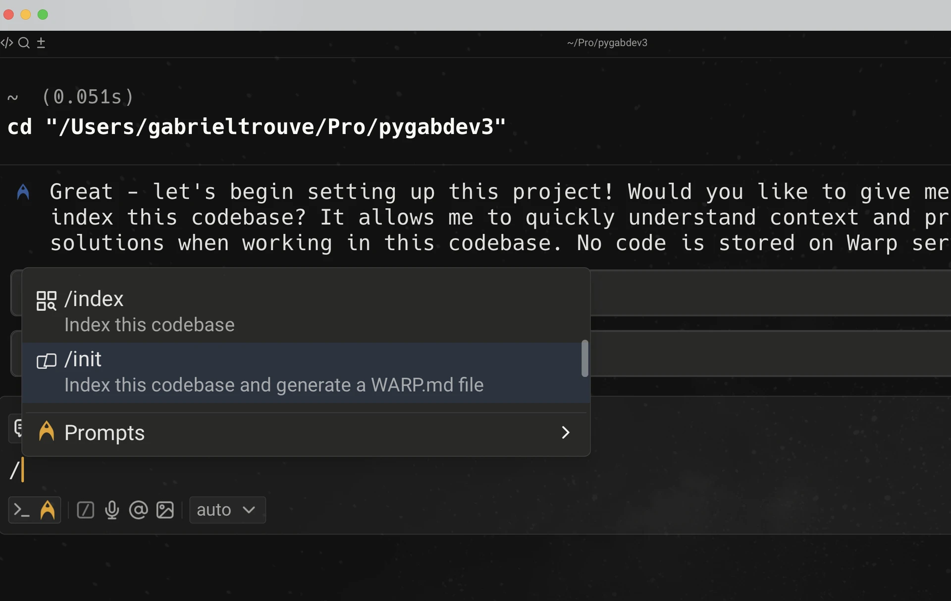 À l'instar de ses homologues, Warp permet d'accéder à un menu de commandes via un bouton. Vous pouvez donc facilement lancer la commande /init pour que Warp intègre en contexte votre base de code :