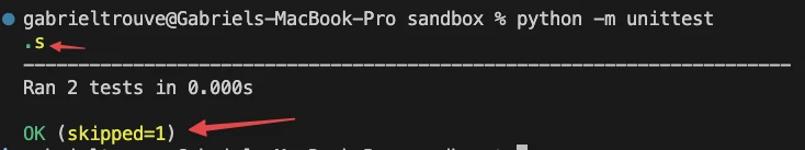 import unittest import sys class TestFonctionnalitesAvancees(unittest.TestCase): @unittest.skip("La fonctionnalité n'est pas encore développée") def test_envoi_email(self): pass @unittest.skipIf(sys.platform == "win32", "Ne fonctionne pas sous Windows") def test_chemin_fichier_unix(self): self.assertTrue(True)