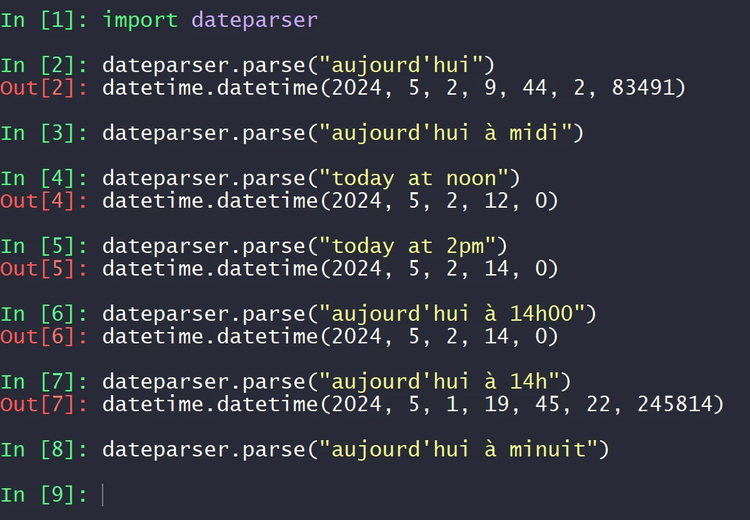 Bonjour, j'ai fait quelques tests sur le module dateparser, qui est effectivement assez bluffant, mais je me permets quand même de signaler certaines limites (en tout cas avec la langue française). Dans la capture d'écran ci-dessous, les lignes 3, 7 et 8 donnent des résultats None ou erronnés. Donc un bon module mais à utiliser quand même avec certaines précautions.
