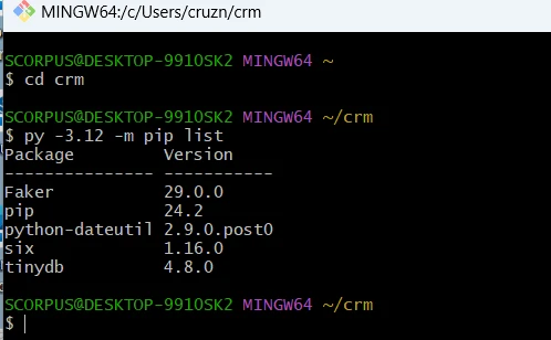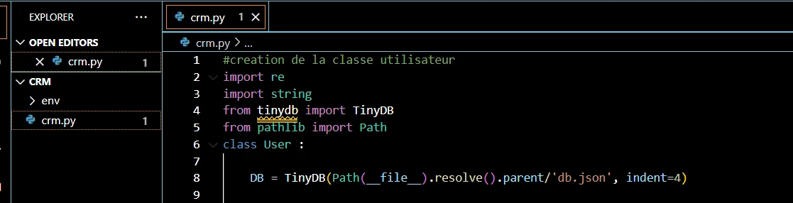 00:01:21 :données pour chaque utilisateur. Donc moi je vais faire un attribut ici directement dans ma classe,donc je vais l'appeler db, et ça va être une instance de tiny db comme ceci, et on va ensuitemettre un chemin absolu vers un fichier json qui sera à l'intérieur du dossier crm. Pour ça on va
