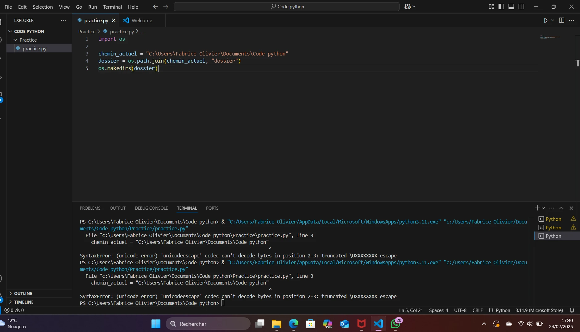 00:01:52 :Donc je sauvegarde, j'exécute le script et on se retrouve bien donc avec notre chemin completet le slash qui a été ajouté automatiquement entre le dossier formation développeur Python et le nom de mon dossier ici.